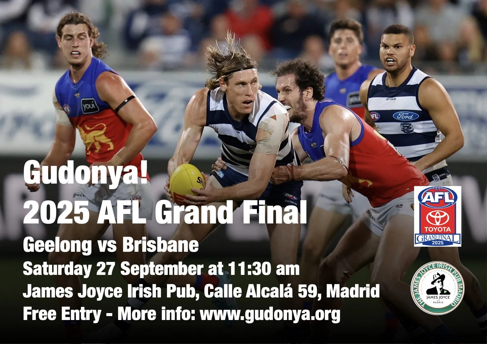 Join us to watch a DELAYED showing of the AFL Grand Final at the James Joyce Irish Pub in Madrid on the last Saturday of September (no surprise).
